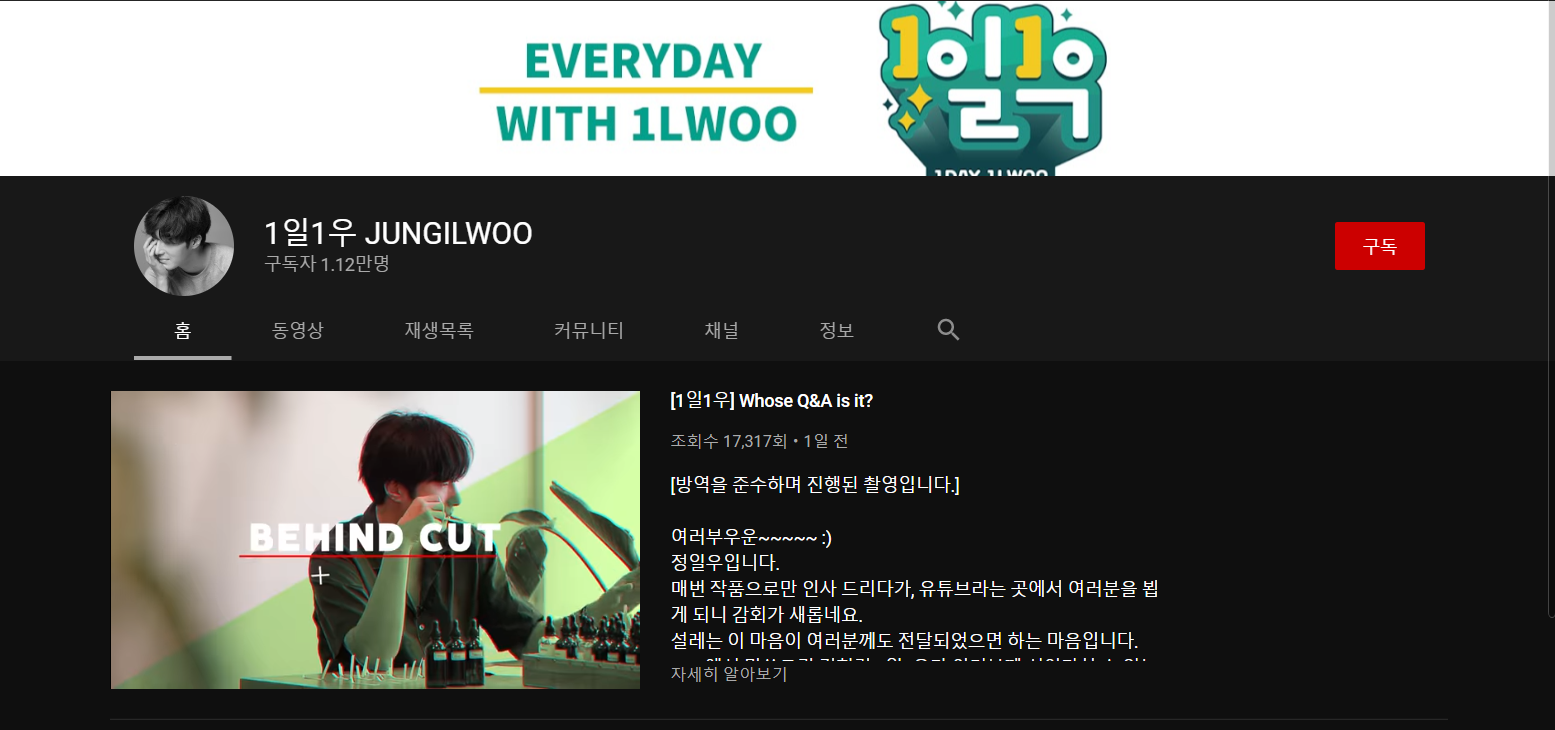 정일우는 27일 유튜브 채널 1일 1우를 개설하고 첫 영상으로 Q&A영상을 올렸는데요. 이 영상에서 정일우는 앞으로 유튜브를 통해 어떤 모습을 보여줄지에 대한 소개와 본인이 출연한 작품과 예능에 대한 간단한 코멘트를 답했습니다. 28일 오후 9시 기준으로는 구독자 1.12만명을 기록하고 있습니다.