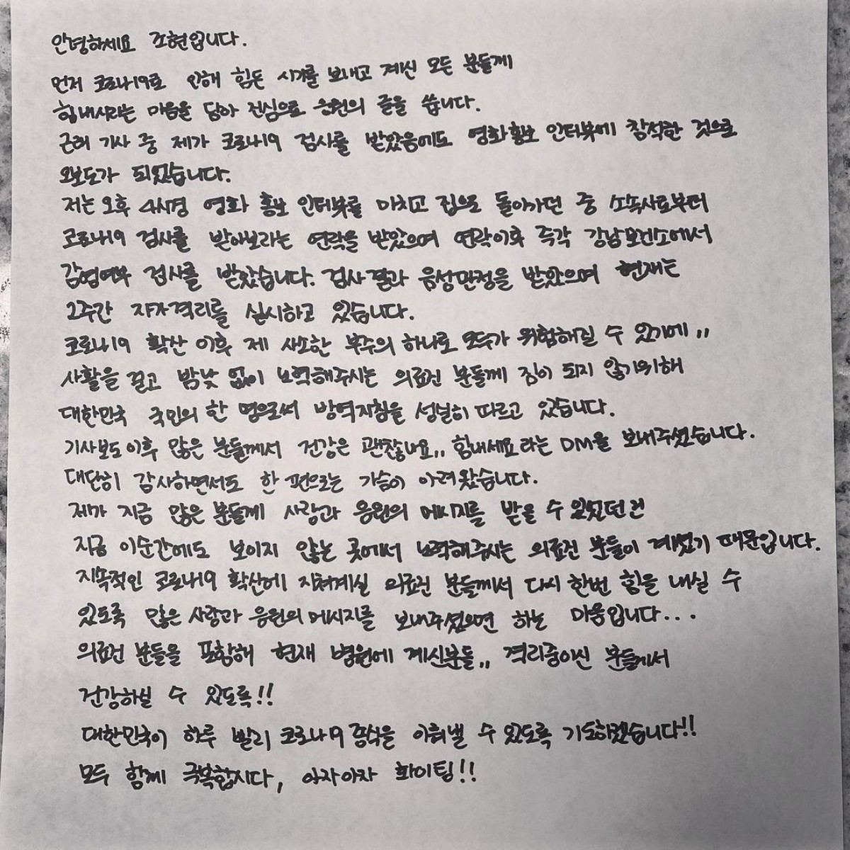 저는 오후 4시경 영화홍보 인터뷰를 마치고 집으로 돌아가던 중 소속사로부터 코로나19 검사를 받아보라는 연락을 받았으며 연락 이후 즉각 강남보건소에서 감염여부 검사를 받았습니다.