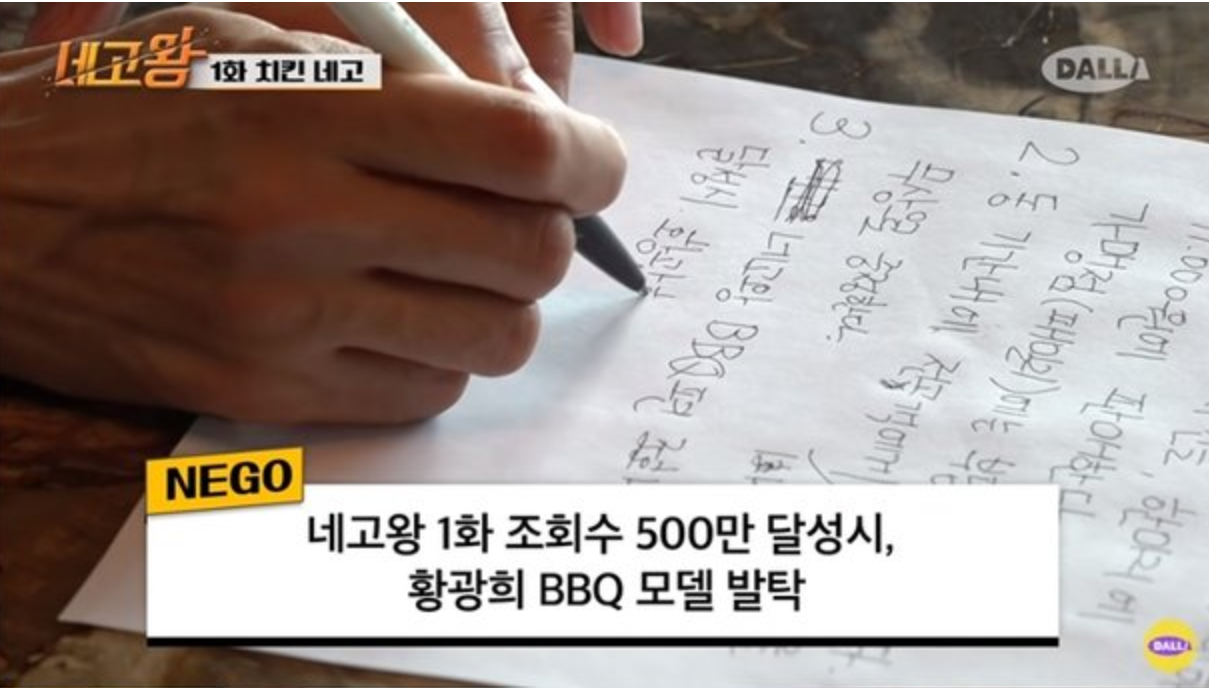 앞서 8월 7일 공개된 광희의 유튜브 채널 '네고왕' BBQ 편에서 광희와 윤홍근 회상이 협상하는 모습이 나왔었는데요. 이를 통해 한 달간 치킨 가격 7천원이라는 파격적인 행사를 이끌어냈습니다. 광희는 당시 BBQ와 계약서를 작성하면서 해당 유튜브 영상 시청이 500만 뷰가 넘을 시 브랜드 광고 모델을 시켜달라는 조항을 넣어달라고 요청했고 윤 회장의 동의를 얻어 광희 공약이 되었습니다.