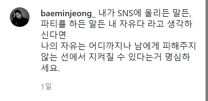 배민정은 본인의 인스타그램에 코로나19 확산 방지에 대한 목소리를 높였는데요. "내가 SNS에 올리든 말든, 파티를 하든 말든 내 자유다 라고 생각하신다면 나의 자유는 어디까지나 남에게 피해주지 않는 선에서 지켜질 수 있다는거 명심하세요"라고 하며 "오늘 병상이 없어서 6명이 사망했습니다. 의료 붕괴가 코앞인데 이런 시국에 홈 파티니 술자리니 연말 파티하시는 분들. 거기다 인스타에 자랑까지 하시는 분들. 그냥 본인 무식하고 머리 비었다고 소문내는 거예요"라고 일침을 가했습니다.