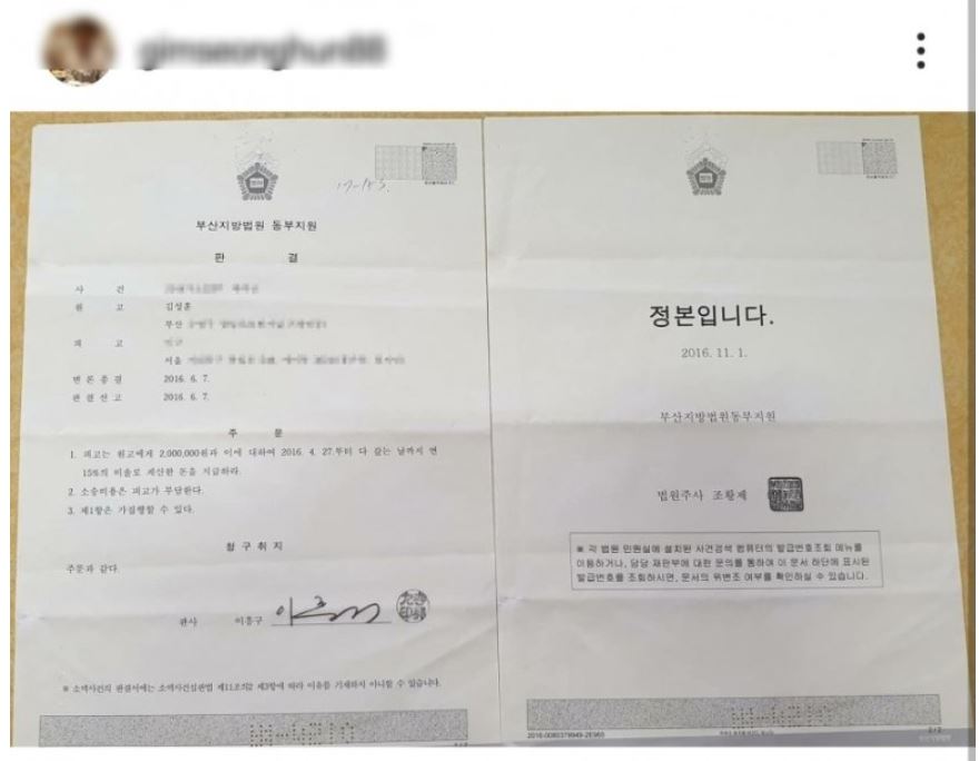 해당 누리꾼은 이근 대위의 채무불이행 민사소송 판결문도 함께 게재했는데요. 해당 판결문에는 ‘2016년 6월 7일 피고(이근 대위)는 원고에게 200만 원과 이에 대해 2016년 4월 27일부터 다 갚는 날까지 연 15%의 비율로 계산한 돈을 지급하라’고 적혀있습니다.