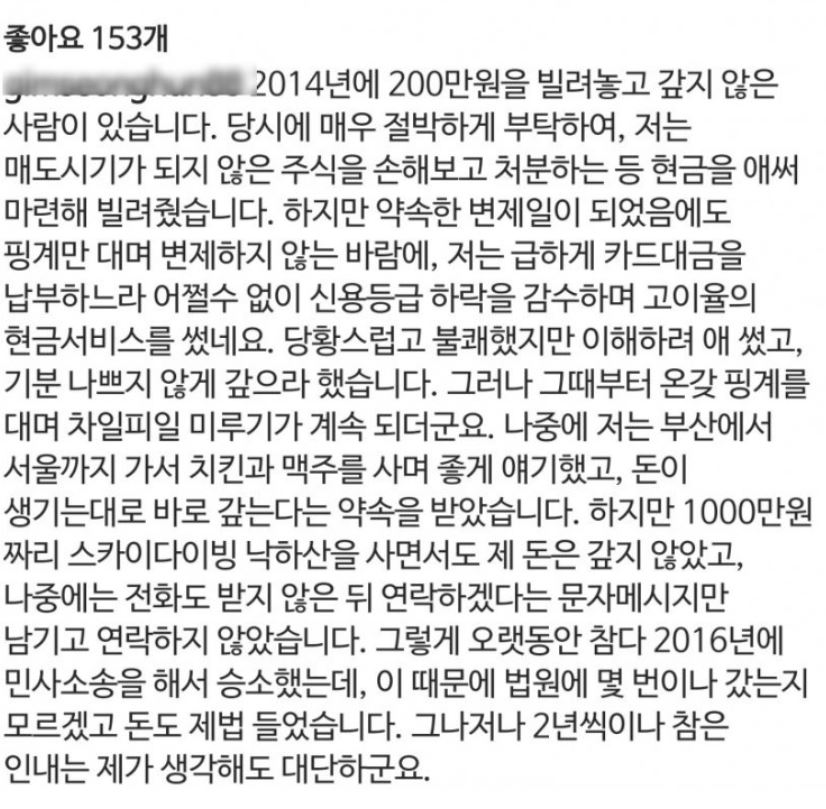 지난 10월 2일 한 누리꾼은 2일 인스타그램 계정을 통해 이근 대위 ‘빚투’ 의혹을 제시했는데요. 이 누리꾼은 “2014년 200만 원을 빌리고 갚지 않은 사람이 있다”며 “약속한 변제일이 됐음에도 핑계를 대며 변제하지 않았다”고 적었습니다. 또한, “급하게 카드 대금을 납부하느라 신용등급 하락을 감수하며 고이율의 현금서비스를 썼지만 온갖 핑계를 대며 차일피일 미루기가 계속됐다. 오랫동안 참다 2016년에 민사소송을 해서 승소했는데 이 때문에 법원에 몇 번이나 갔는지 모르겠고 돈도 제법 들었다”며 “지인들한테는 ‘돈 빌린 적 없는데 이상한 소리를 한다’ ‘갚았는데 이상한 소리를 한다’는 말을 한다고 한다”고도 밝혔습니다.