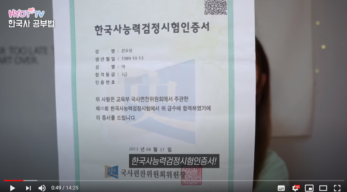 전효성이 한국사 3급에 합격했다는 사실을 개인 유튜브 채널에 공개했습니다. 한국사 3급은 한국사능력검정시험을 통해 취득하는 자격증인데요. 점수에 따라 1급, 2급, 3급으로 등급 별 자격증을 취득할 수 있습니다.