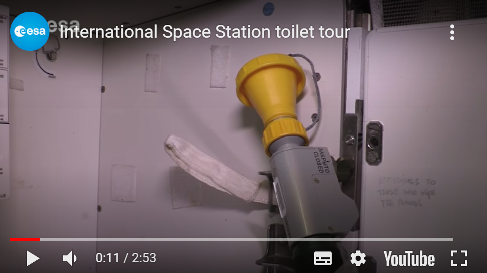 우주정거장 화장실에서 배설물 처리하는 방법은 유튜브에서 설명되어 있는데요. 아래 캡처 사진에서 보이듯이 강력한 흡입력을 자랑하는 호수나 의자에서 소변, 대변을 처리한다고 하네요.