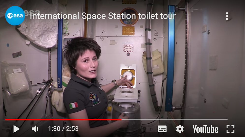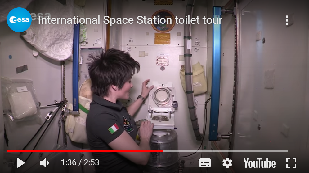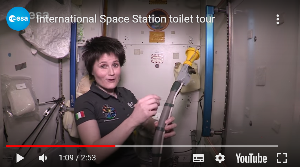 우주정거장 화장실에서 배설물 처리하는 방법은 유튜브에서 설명되어 있는데요. 아래 캡처 사진에서 보이듯이 강력한 흡입력을 자랑하는 호수나 의자에서 소변, 대변을 처리한다고 하네요.
