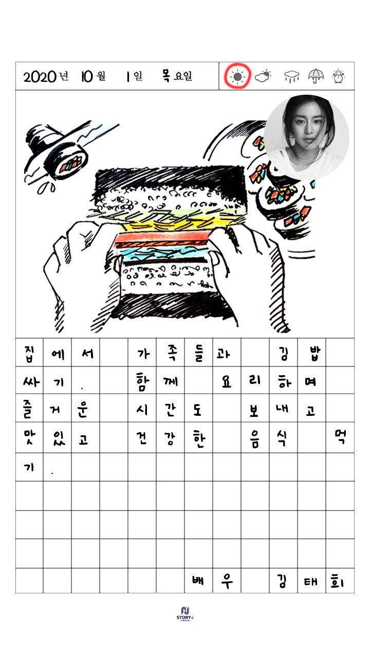김태희의 소속사 스토리제이에서 추석 맞이 스타들의 추석 일상을 그림일기로 공개했습니다. 각 스타들이 그림일기를 작성해 공식홈페이지에 공개했는데요. 그 중 단연 화재된 그림일기는 김태희 그림일기 입니다. 우리나라 최고의 미모를 자랑하는 김태희는 추석에 어떤일을 할까요? 김태희 그림일기에 따르면 "가족들과 김밥 싸기, 함께 요리하며 즐거운 시간 보내고 맛있고 건강한 음식 먹기"라고 적혀있네요. 추석때는 가족들과 맛있는 음식 먹는 것만으로도 행복한 것 같습니다.