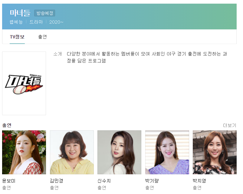 '마녀들’은 MBC에서 선보이는 새로운 디지털 예능 방송의 이름입니다. '마녀들'은 ‘시속 100km 시구 도전’으로 주목 받은 웹예능 ‘마구단(2017)’ 제작진이 3년 만에 선보이는 ‘스포츠 미션 리얼버리이어티’ 프로젝트입니다. 다양한 분야에서 활동하는 여성 멤버들이 한 데 모여 사회인 야구 경기 출전에 도전하는 과정을 담은 프로그램이라고 하네요.