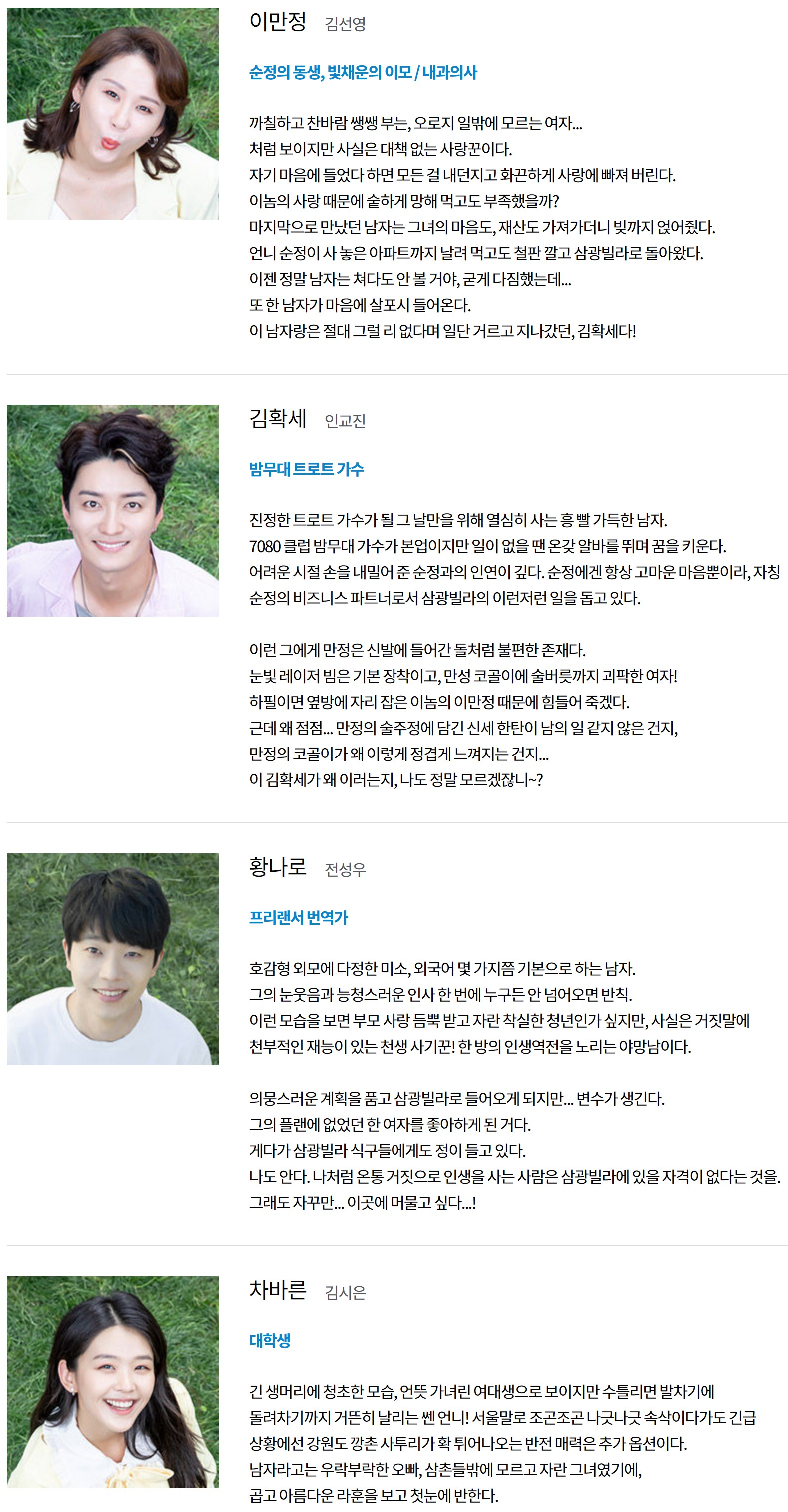 다양한 사연들을 안고 '삼광빌라'에 모여든 사람들, 타인이었던 이들이 서로에게 정들고 마음을 열고 사랑하기까지의 과정을 그린 드라마인데요. 주인공들이 삼광빌라라는 주택에 하숙생처럼 모여살면서 일어나는 여러 에피소드를 그리고 있는데요. 사람마다 사연이 있고 그 사연들이 얽혀있어 더욱더 재미난 스토리를 보여주고 있습니다.