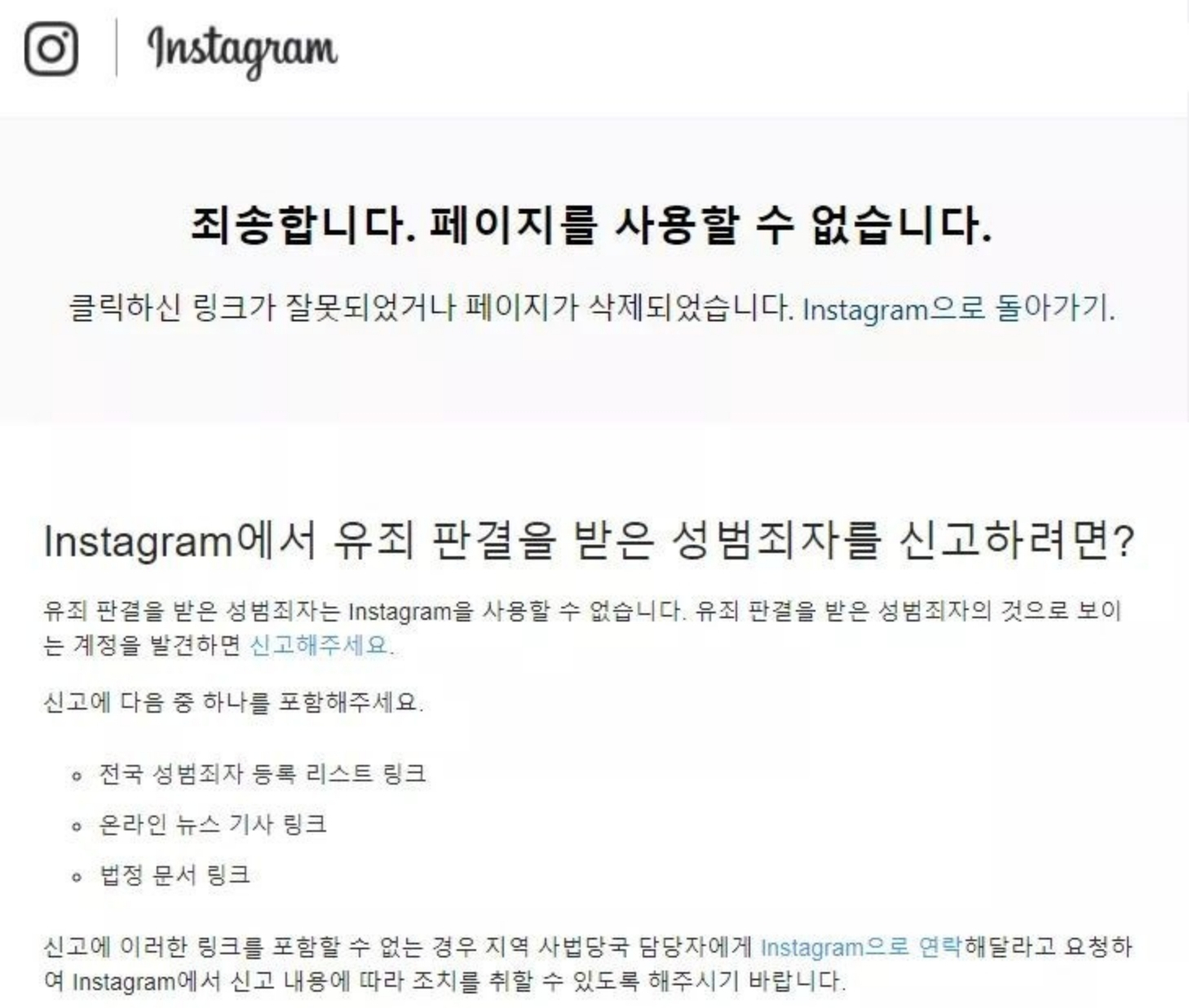 그런데 하루만에 고영욱 인스타그램 계정이 삭제 됐는데요. 현재는 접속 시 페이지를 찾을 수 없다는 문구가 표출되고 있습니다. 본인이 삭제했다고 보기보다 강제로 삭제됐다고 보는 시선이 많은데요. 인스타그램은 성폭력 유죄판결을 받은 사람의 인스타그램 사용을 제한하고 있는데요. 신고 시 온라인 뉴스 기사 링크, 법정 문서 링크, 전국 성범죄자 등록 리스트 링크를 포함해 신고하면 계정을 강제삭제하고 있습니다.